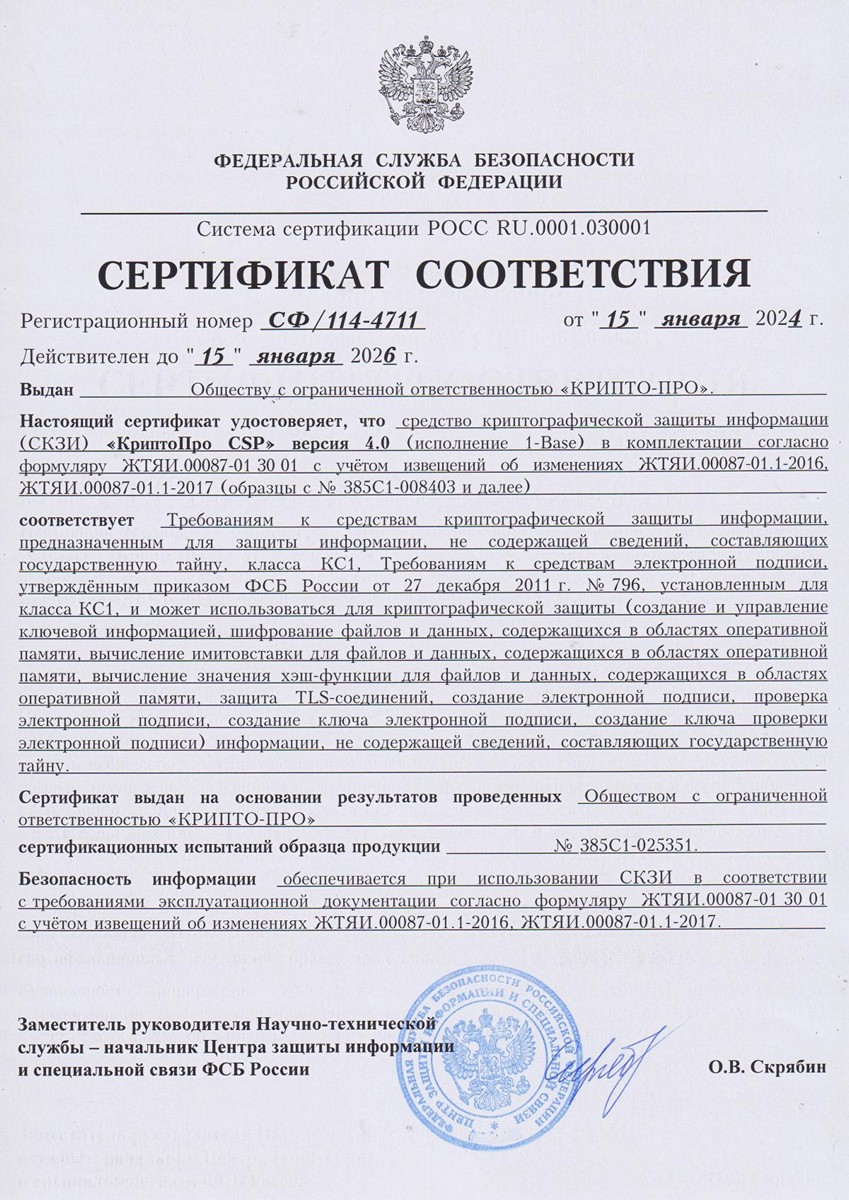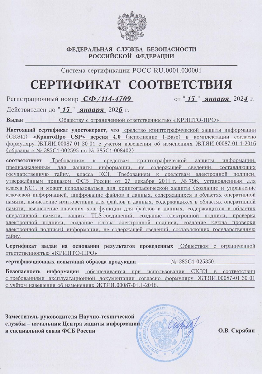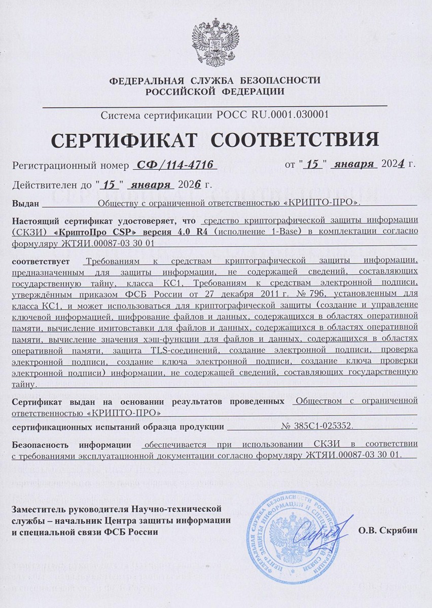 - Сертификат соответствия КриптоПро CSP 4.0 R2 1-Base (сборка 9842, КС1) № СФ/114-4709