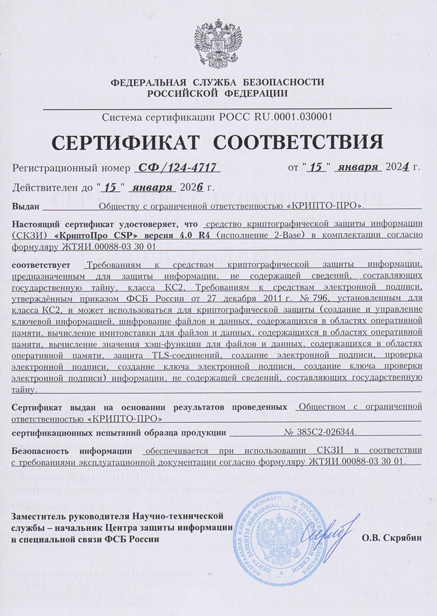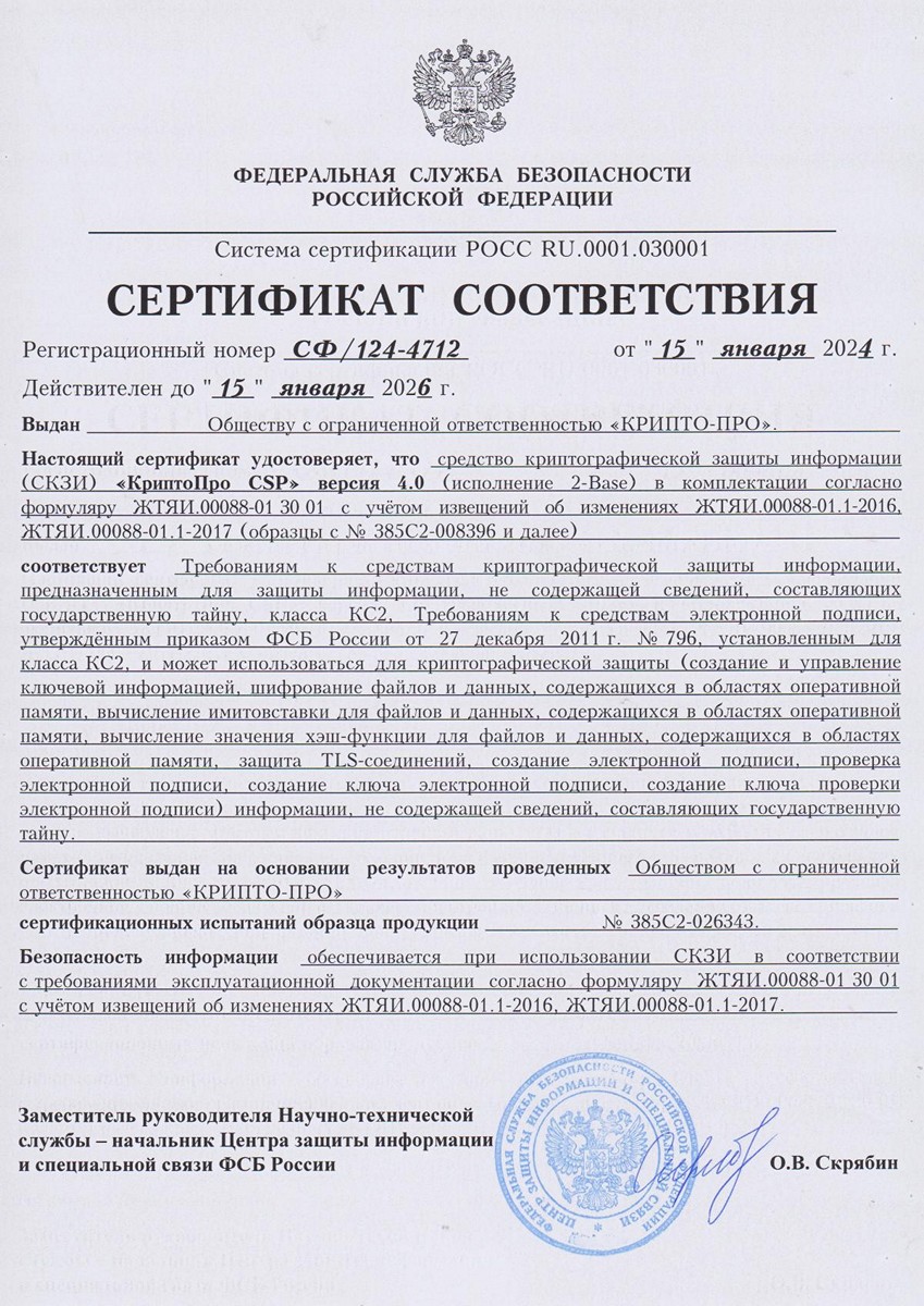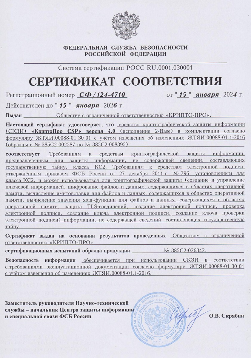 - Сертификат соответствия КриптоПро CSP 4.0 R2 2-Base (сборка 9842, КС2) № СФ/124-4710