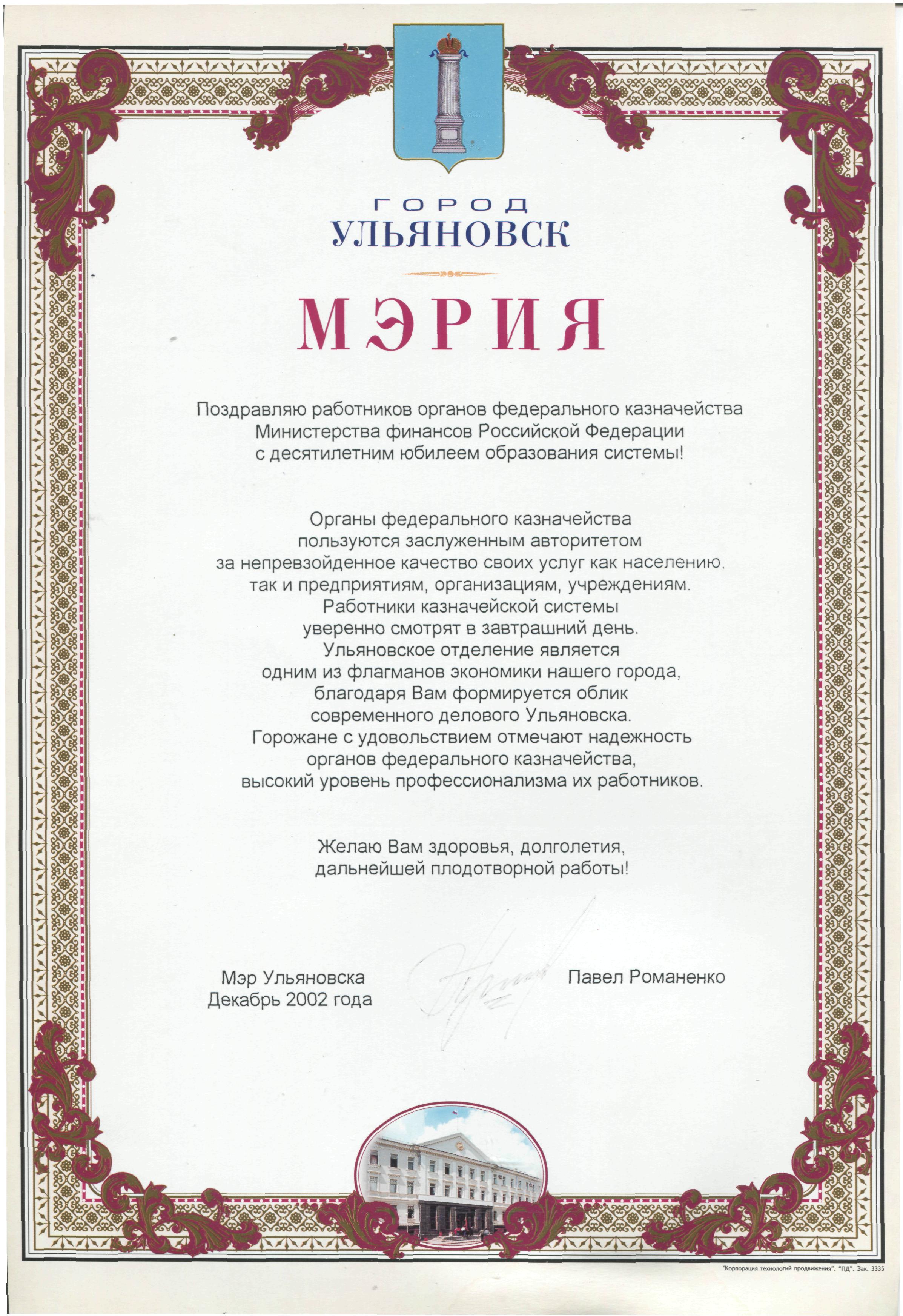 - Поздравительная грамота мэрии города Ульяновска с 10-летним юбилеем