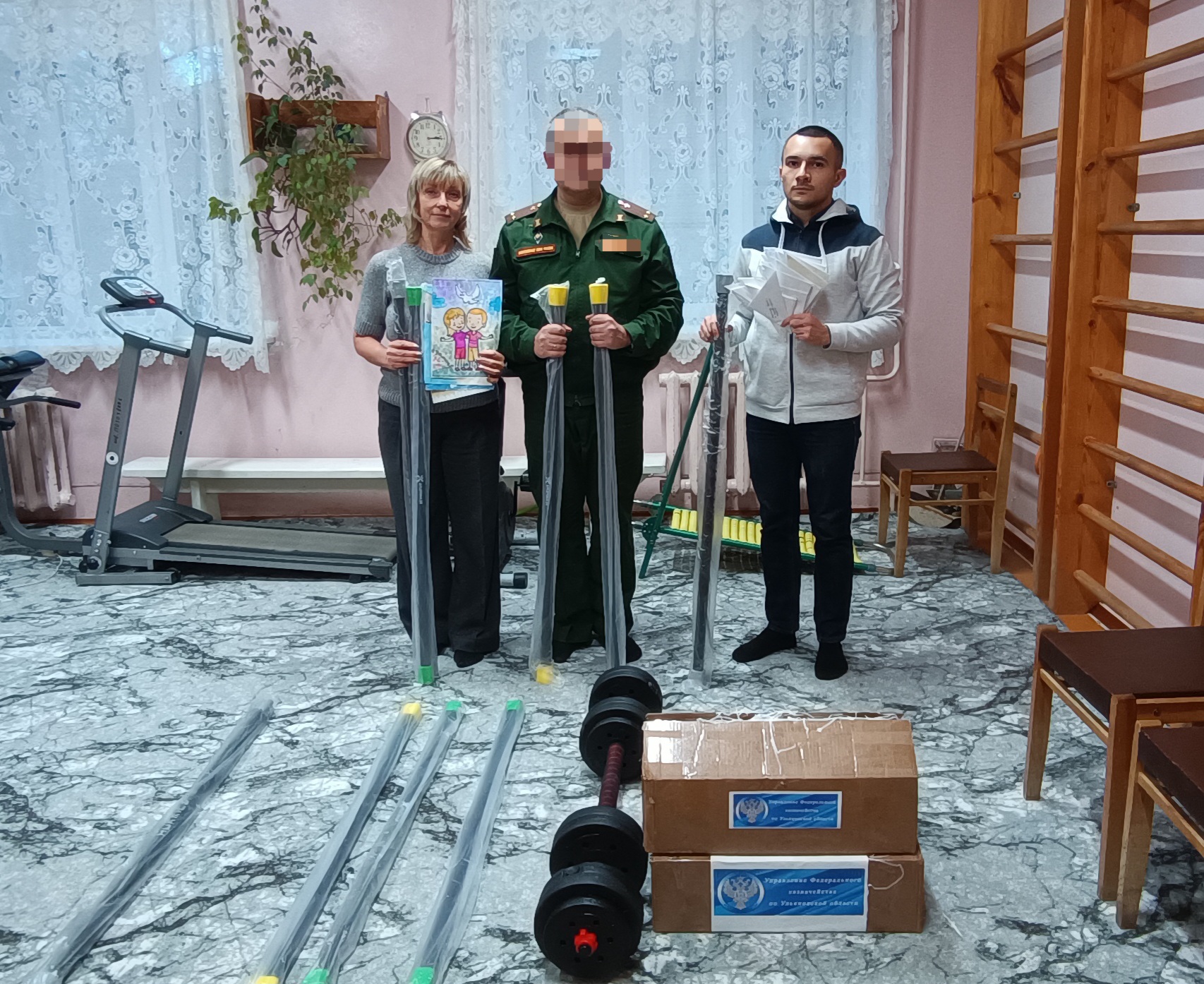 Сотрудниками УФК по Ульяновской области в рамках акции «Для тех, кто в госпиталях», в ходе визита в учреждение, для нужд бойцов-участников СВО, проходящих лечение и реабилитацию в военном госпитале, по запросу были приобретены и переданы разборные гантели и бодибары.