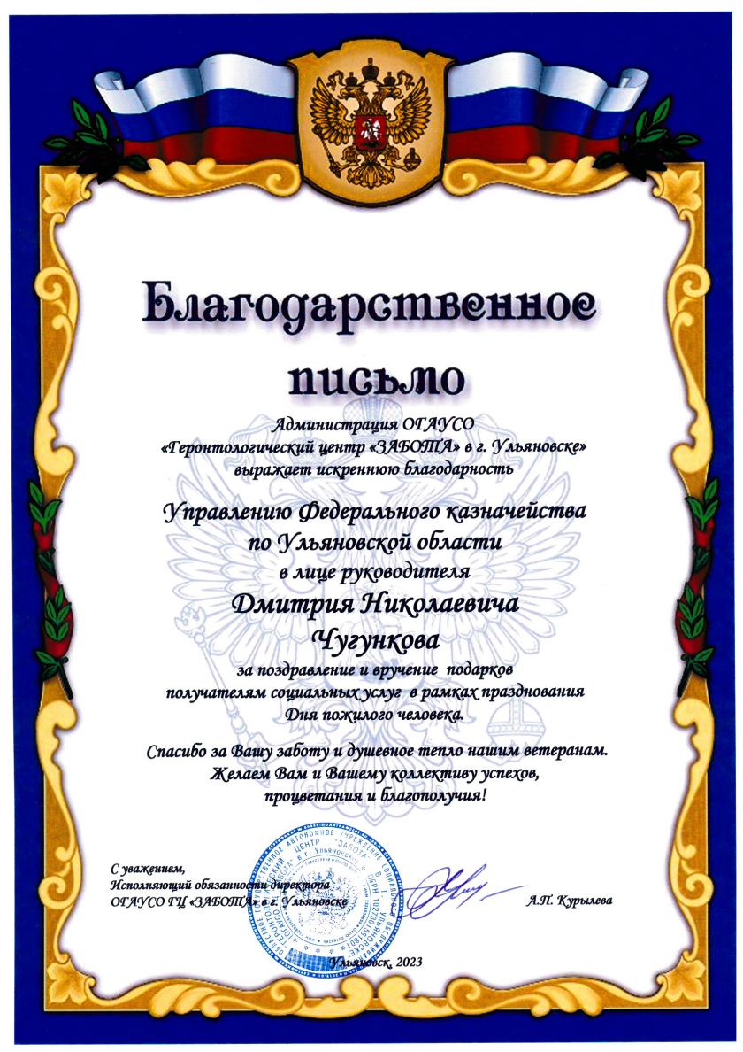 В преддверии Дня пожилых людей 29 сентября 2023 года заместитель руководителя Управления Федерального казначейства по Ульяновской области, представители Молодежного комитета и Совета Ветеранов посетили областное государственное автономное учреждение социального обслуживания «Геронтологический центр « Забота» в г. Ульяновске.